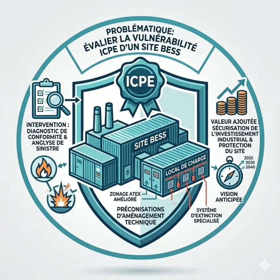 • Problématique : Évaluer la vulnérabilité d'un site de stockage massif de batteries (BESS) vis-à-vis des exigences réglementaires (ICPE).