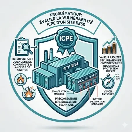 - Problématique : Évaluer la vulnérabilité d'un site de stockage massif de batteries (BESS) vis-à-vis des exigences réglementaires (ICPE).